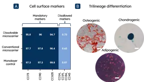 In a flow cytometry experiment conducted by the Fraunhofer ISC TLZ-RT and IBMT, the phenotype of BM-MSCs cultured on Dissolvable microcarriers in the Osilaris™ bioreactor (sampled on day 13) was evaluated. The BM-MSCs exhibited high expression (≥ 95%) of positive surface markers (CD73, CD90, CD105) and low expression (≤ 2%) of the negative markers (CD14, CD19, CD34, CD45), in accordance with the minimal criteria for multipotent mesenchymal stem cells defined by the International Society for Cellular Therapy.5 This expression profile was consistent with that of cells in monolayer control cultures, which showed comparable marker expression patterns (Figure 3A). Moreover, stem cells harvested from the microcarriers maintained robust trilineage differentiation potential, as evidenced by osteogenic, chondrogenic and adipogenic staining (Figure 3B). Taken together, these results confirm the preservation of functional stem cell properties following expansion and harvesting using Dissolvable microcarriers.