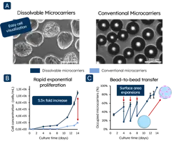 Figure 2B shows the cell concentration over time, revealing that cells cultured on Dissolvable microcarriers reached the exponential growth phase approximately five days earlier than cells cultured on conventional microcarriers. Continued growth was observed after fresh microcarrier additions (day four and six) and after increasing the surface area density (day eight). This continued growth is enabled by bead-to-bead transfer of the cells.